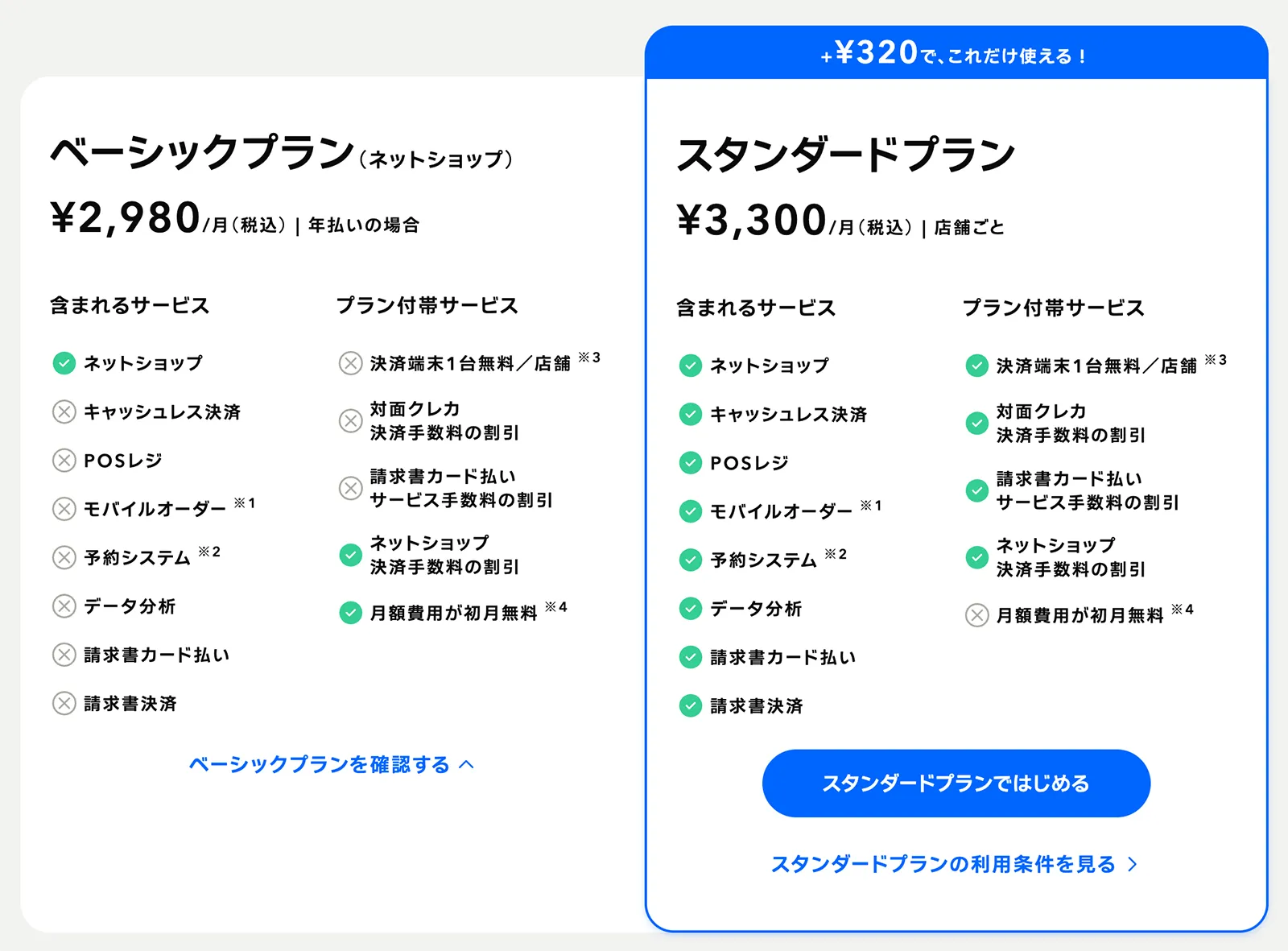| プラン | 月額費用 | ネットショップ決済手数料 |